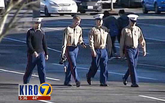 One minute a group of Marine recruiters were sitting in their office in Lynwood, Washington, and the next they were stopping a robbery of an elderly woman and nabbing one of the robbers.