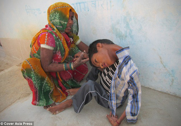 ‘He cannot do anything by himself. He just sits in a corner of the room all day. It’s no life.’She added: ‘I have to carry him like a baby everywhere but he is 12 years old, how will I carry him when he grows even older?’