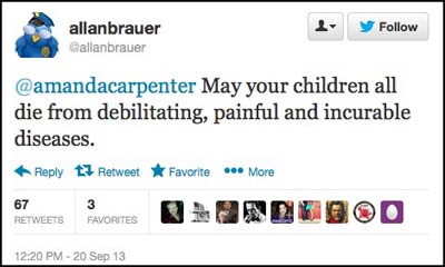 Sacramento County Democratic Party communications chair Allan Brauer was so upset by Amanda Carpenter’s advocacy of defunding ruinous Obamacare that he jumped to his Twitter account to show how much hate is in the heart of Democrats.